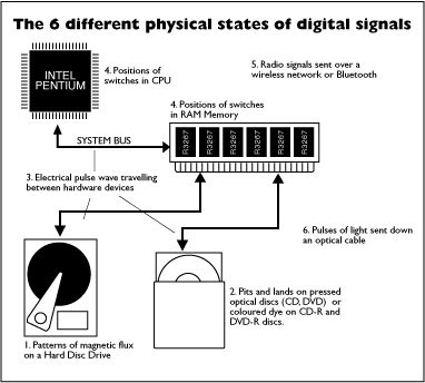 Digital computing involves using electronics to represent 1's and 0's (binary). These 1's and 0's can take 6 different "physical" forms as they travel between and through the various hardware components of a digital computing system.