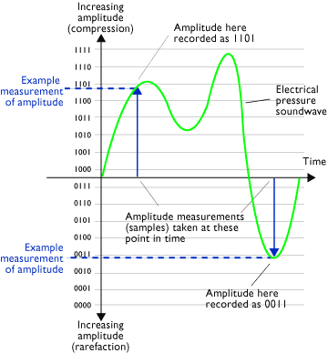 Audio analogue to digital converters work by repeatedly measuring the amplitude (volume) of an incoming electrical pressure soundwave (an electrical voltage), and outputting these measurements as a long list of binary bytes. In this way, a mathematical "picture" of the shape of the wave is created.