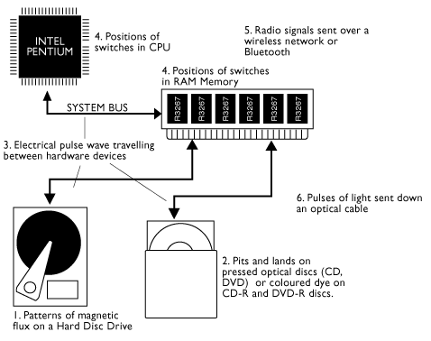 On the surface of a floppy disc or hard drive, 1s and 0s are recorded as a pattern of strong and weak magnetic pulses. More on hard disc drives is here.