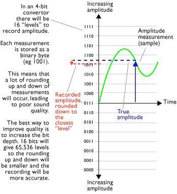 The effects of quantisation errors are most apparent at lower word lengths. Higher word lengths increase the quality of sound but also the quantity of data and therefore file sizes. 16 bit bytes are of course twice as big as 8 bit bytes. CD quality sound requires 5Mb of storage space for 1 mono minute (10Mb for a stereo minute).