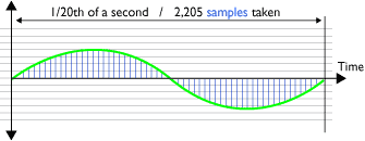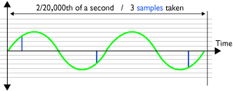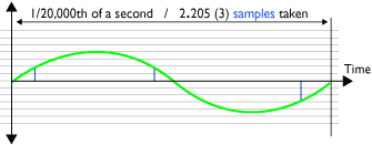 Sampling (A to D) at 44.1KHz of one 20,000Hz cycle (hi treble)