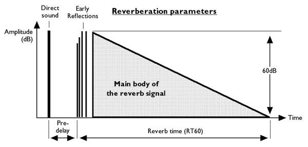 Reverb time (RT60) The length of time it takes for the level of reverberation at 1kHz to decrease by 60dB (virtually to silence). This depends on several factors, room size, shape, type of reflective surfaces etc.